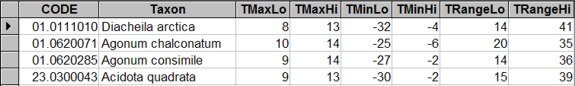 TRangeLo - lowest value of TRange in species envelope